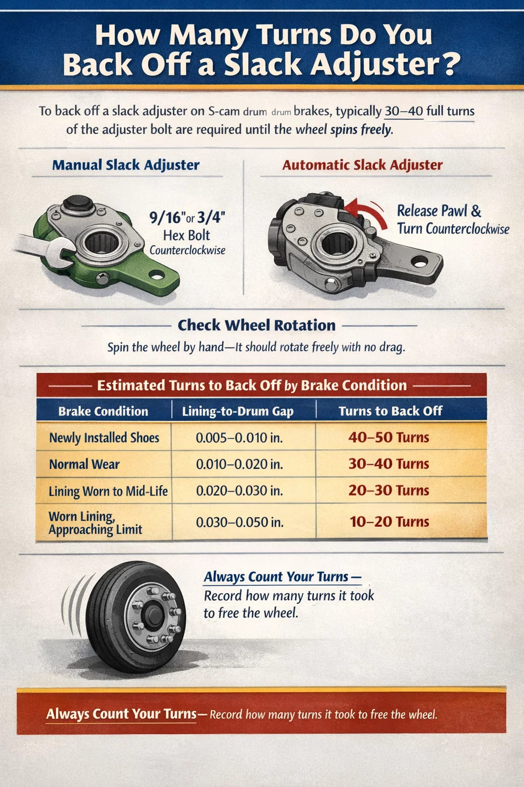 Vexillum procedendi ad tergum remissa adjuster est circiter XXX ad XL plena alternis manibus adjuster telum — vel usque dum calceos fractos plene a tympano retractet, et rota libere sine reti revolvatur. Automatice remissae compositores (ASAs), processus emissio leviter differt: tu distrahe mechanismum pedem et manually retrahe adjuster off donec pushrod itinerarium est intra spec vel dumeta tympani manifesta sunt. Numerus alternarum secundum exactus variat secundum constitutionem, exemplar, et current status temperatio fregit, sed 30-40 vices certa baseline est pro pluribus systematibus S-cam tympani fregit.