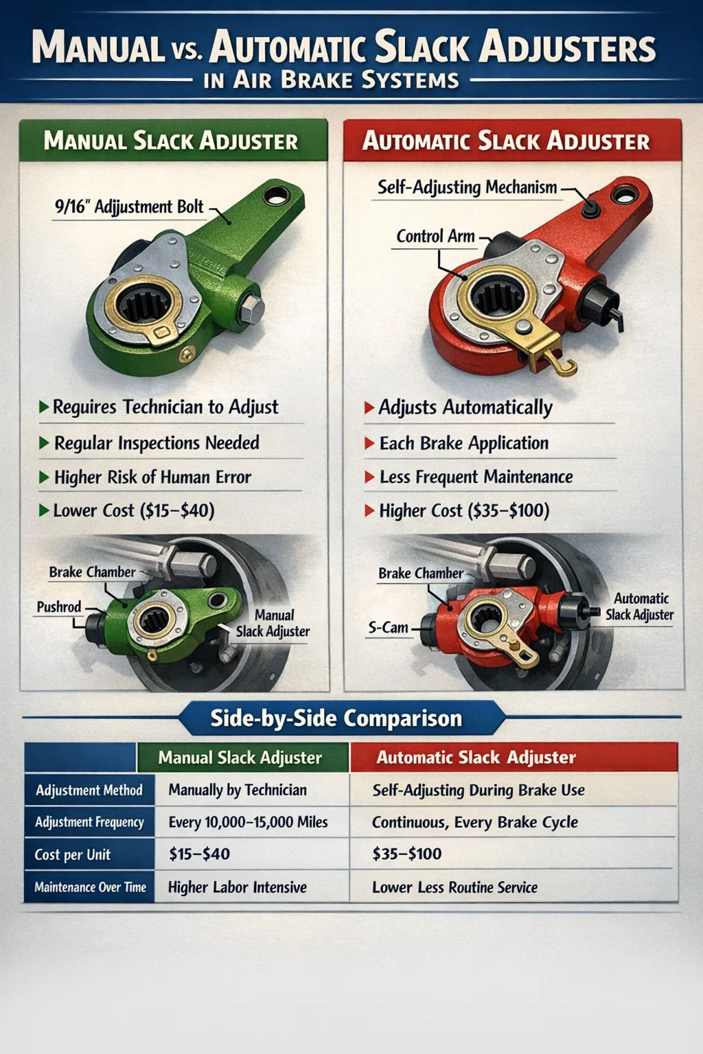 Utraque genera res intelligens utrum procurator classis es, agitator commercialis, technicus fregit, vel aliquis pro CDL studebat. Constitutiones foederales sub FMCSA 393,47 strictas limites in peregrinatione pushrod posuerunt, et inspectio deficiente propter iaculis temperatio-nisum statim vehiculum atterere potest. Sciens quomodo unum- quodque genus operarum dissolutorum compositorem et quid in unoquoque peccari possit, vehicula facilia, tuta, et in via servat.